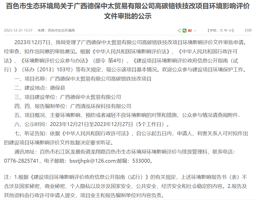 12月21日,百色市生态环境局就广西德保中太贸易有限公司高碳铬铁技改项目环境影响评价文件作出审批意见并对外进行公示,公示时间:2023年12月21日至2023年12月27日(5个工作日)。